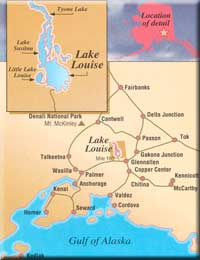 From Anchorage a 3.0 hour drive East on the Glenn Highway (#1); turn left onto the paved Lake Louise Road at Mile 160 and drive north to Mile 16.5; turn right at the sign of Evergreen Lodge.
